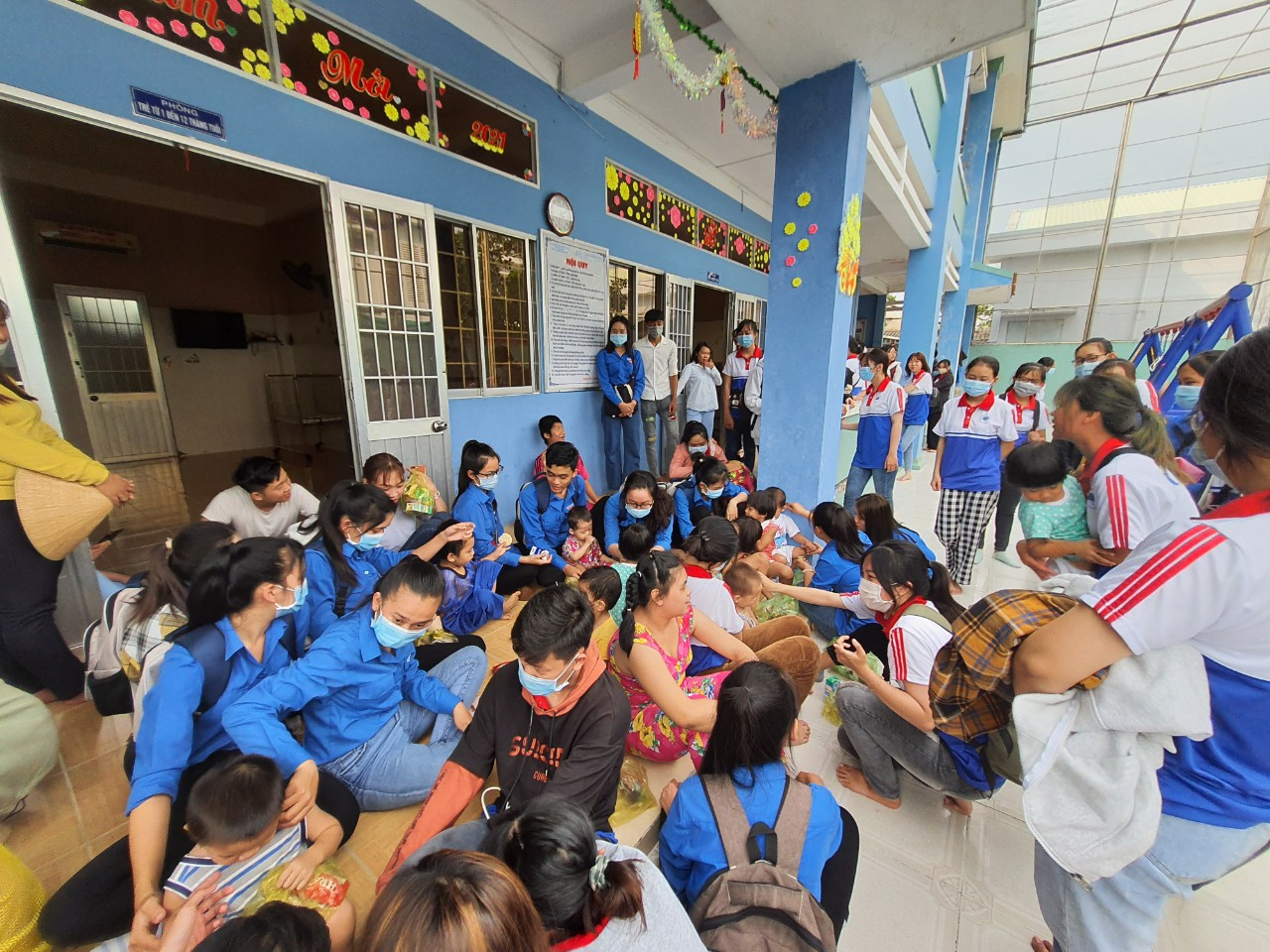 Các bạn đoàn viên thanh niên nói chuyện và chơi đùa với các bé