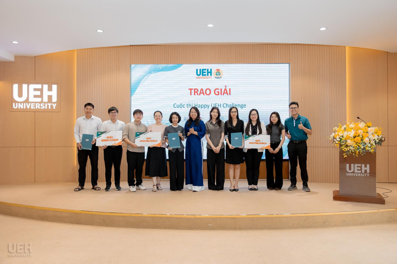 Ban Giám đốc UEH và Ban Thường vụ Công đoàn UEH trao giải thưởng cho các nhóm đạt giải Nhất, Nhì, Ba, Khuyến khích và Bình chọn cuộc thi Happy UEH Challenge
