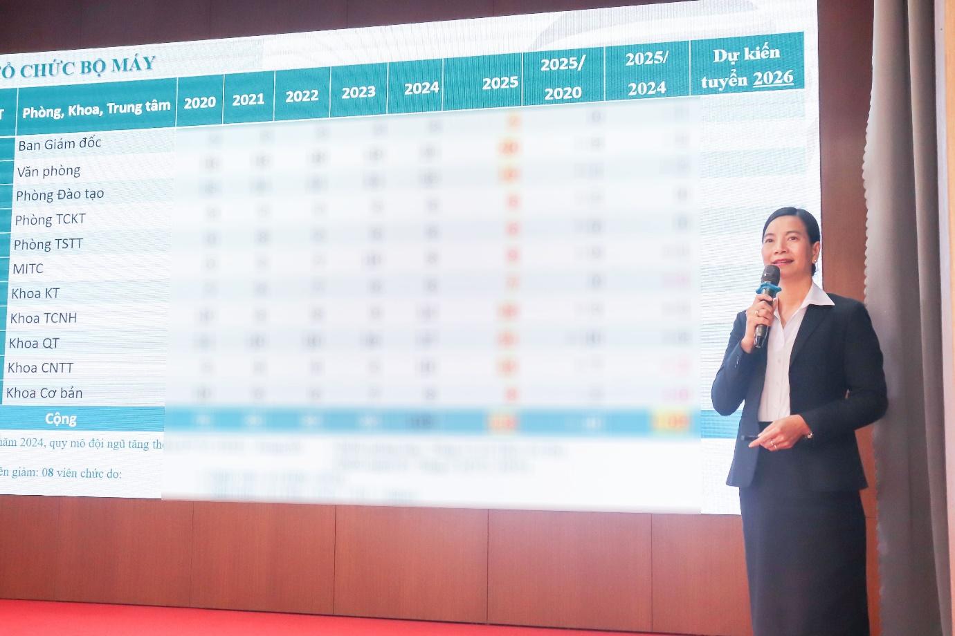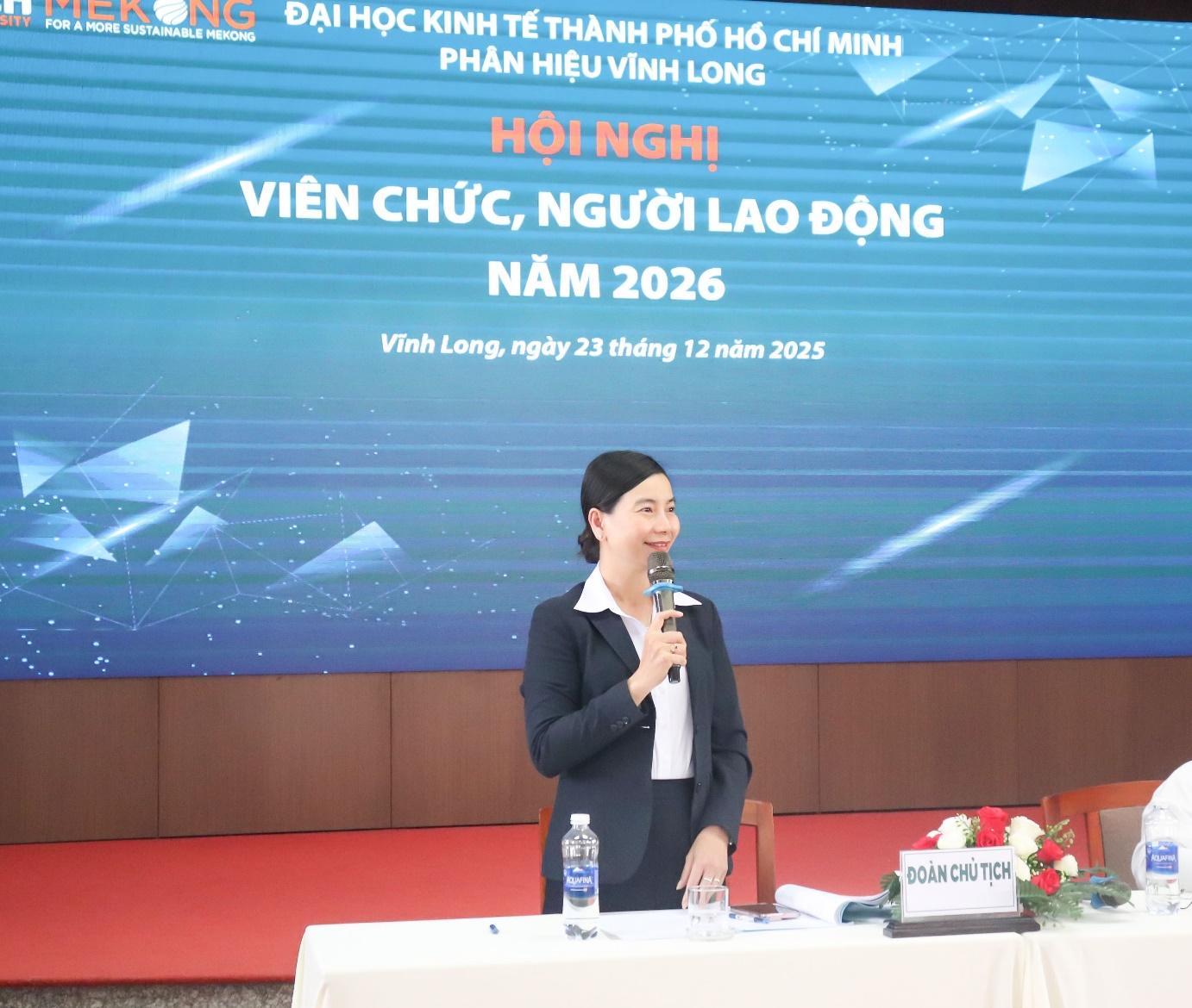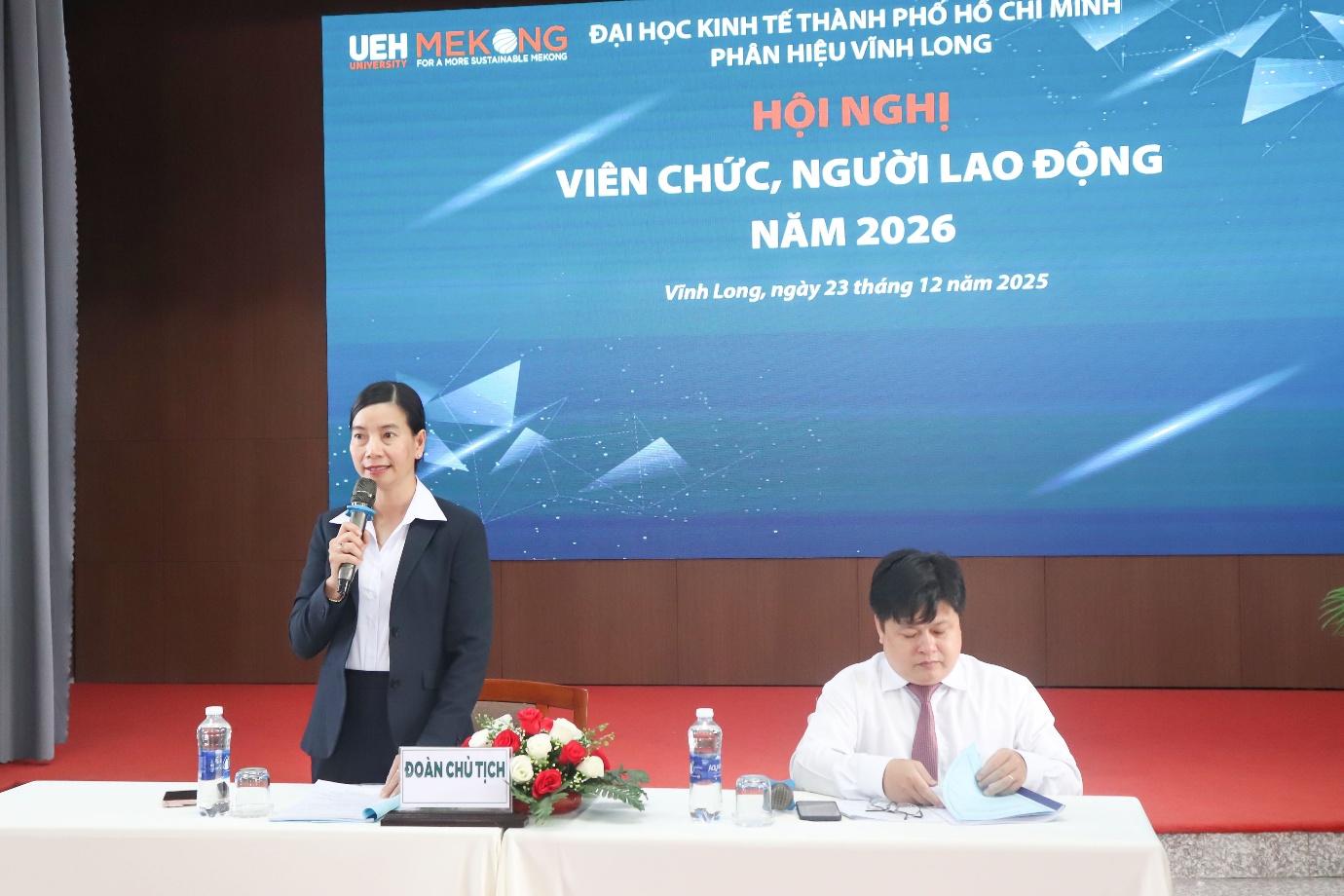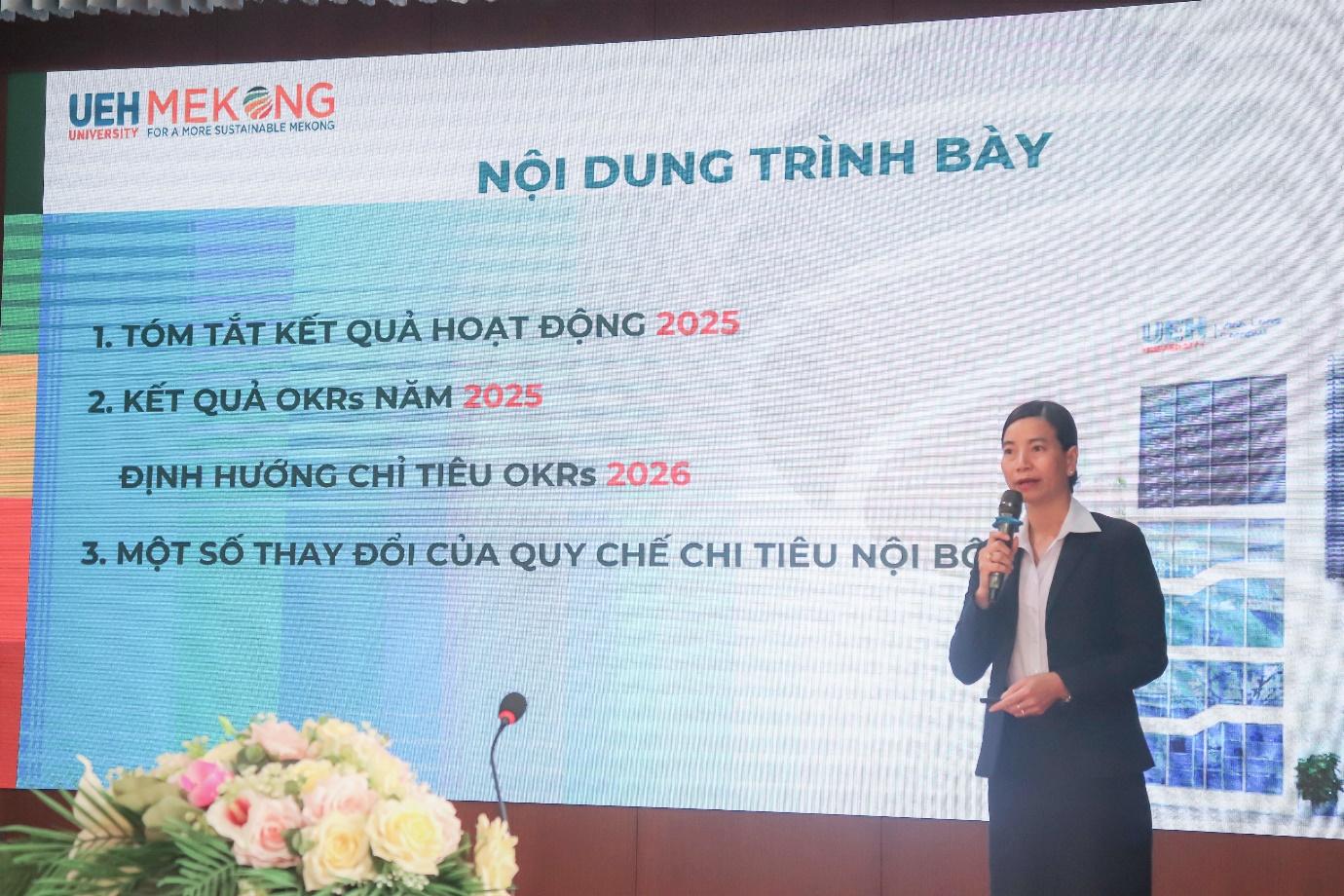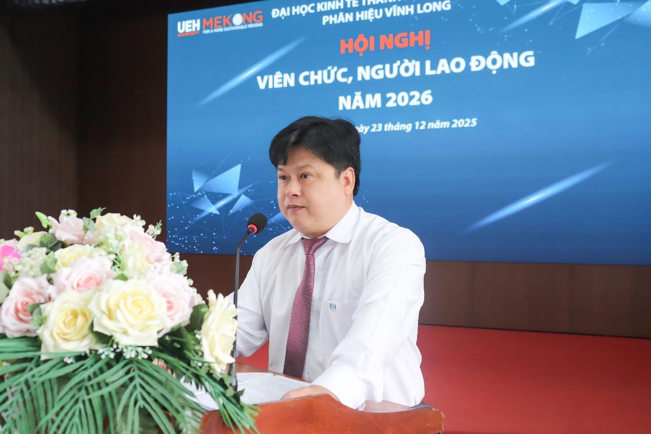 Tiếp nối chương trình, ThS. Hồ Thiện Quyền - Phó Giám đốc UEH Mekong đã trình bày tổng kết ý kiến đóng góp của viên chức, người lao động về các hoạt động trong năm 2025 và lên kế hoạch hoạt động cho các lĩnh vực, phương hướng của Phân hiệu trong năm 2026, dựa trên tinh thần xây dựng, cùng hướng tới mục tiêu vì sự phát triển của UEH Mekong.