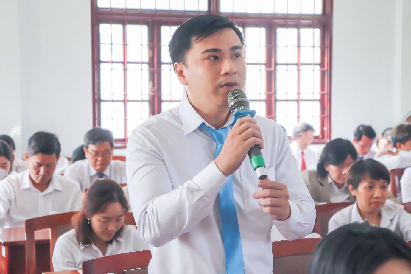 ThS. Bùi Thị Cẩm Tú - Phó Bí thư Chi đoàn cơ quan thay mặt đội ngũ giảng viên trẻ đóng góp ý kiến tại Hội nghị