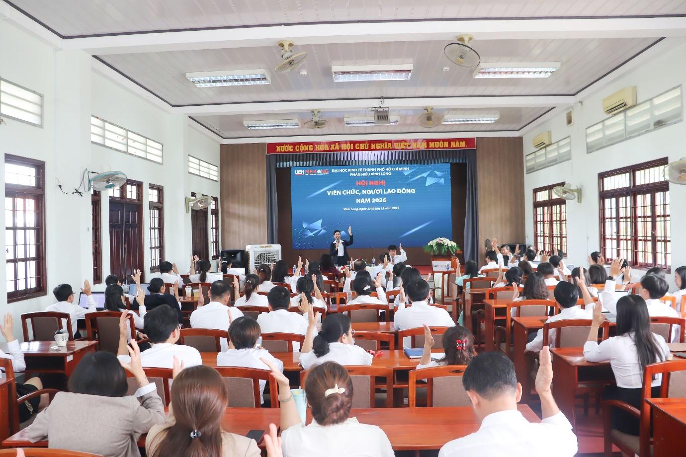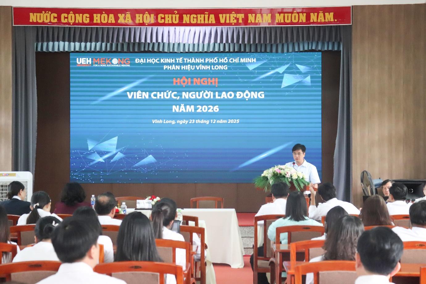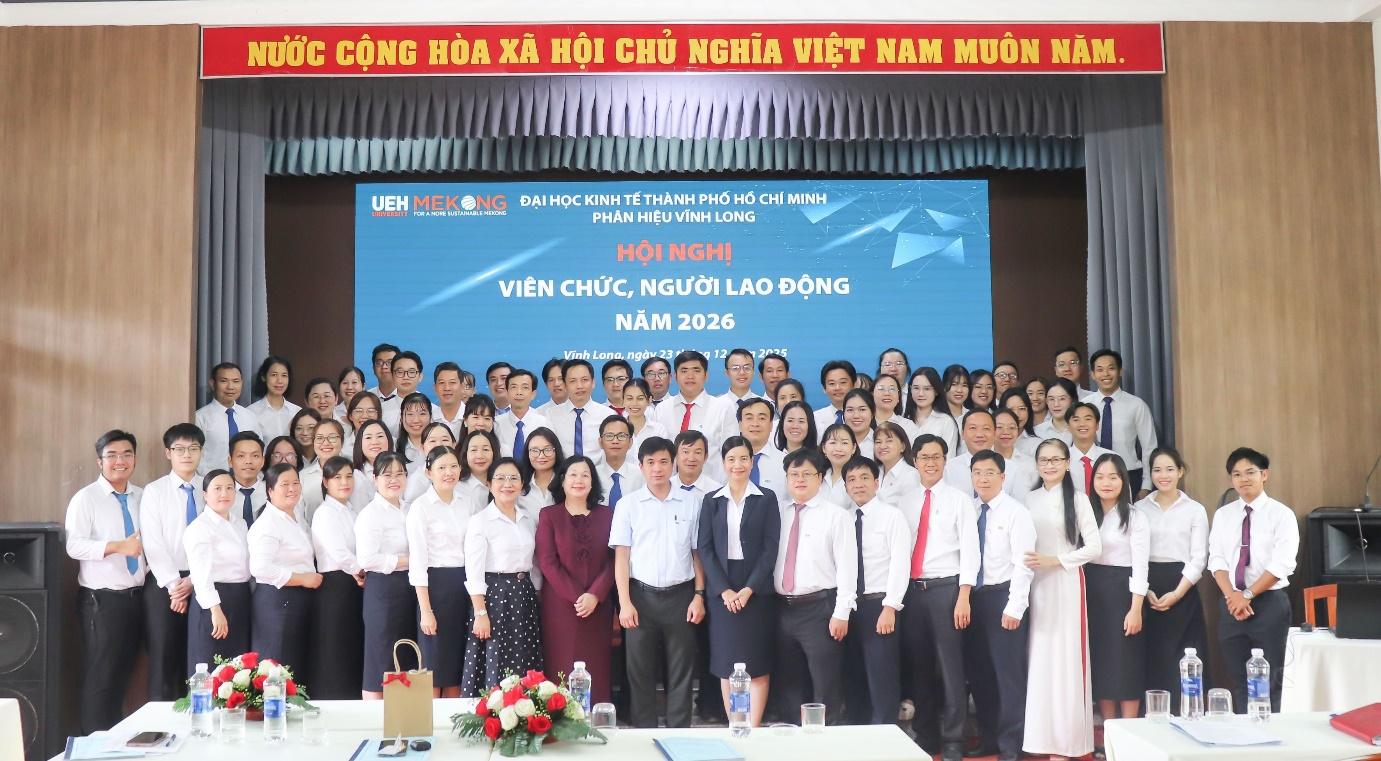 Ngày 23/12/2025, tại hội trường A3.1, UEH Mekong đã long trọng tổ chức Hội nghị viên chức, người lao động năm 2025, nhằm tổng kết, đánh giá kết quả thực hiện Nghị quyết Hội nghị viên chức, người lao động năm 2025, đồng thời đề ra phương hướng, mục tiêu và nhiệm vụ trọng tâm cho năm 2026.