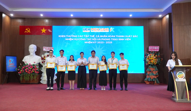 Đồng chí Trần Thị Ngọc Thoại - Ủy viên BTV tỉnh Đoàn, Phó Chủ tịch thường trực Hội Sinh viên Việt Nam tỉnh Vĩnh Long trao Giấy khen của Hội Sinh viên tỉnh cho Tập thể Hội SV UEH Mekong nhiệm kỳ 2023-2025