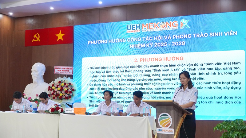 Cũng tại Đại hội, TS. Nguyễn Thị Thý Liễu - Bí thư Đảng ủy bộ phận, Phó Giám đốc phụ trách UEH Mekong cũng ghi nhận và biểu dương những thành tích mà Hội Sinh viên UEH Mekong đã đạt được trong nhiệm kỳ 2023-2025. Đồng chí nhấn mạnh: “Công tác Hội hơn hai năm qua đã có nhiều đổi mới mạnh mẽ, được triển khai đồng bộ, hiệu quả, thể hiện rõ qua những kết quả nổi bật trong báo cáo trình Đại hội. Hoạt động giáo dục chính trị, tư tưởng; phong trào nghiên cứu khoa học, khởi nghiệp; giao lưu quốc tế,... đã góp phần xây dựng môi trường rèn luyện toàn diện cho sinh viên, nâng cao chất lượng hội viên và uy tín của tổ chức Hội. Bước vào nhiệm kỳ 2025-2028, với nhiều yêu cầu mới, Hội Sinh viên UEH Mekong cần mạnh mẽ hơn, sáng tạo hơn và tập trung vào 6 nhiệm vụ sau: [1] Tiếp tục bồi dưỡng lý tưởng - bản lĩnh - văn hóa UEH cho sinh viên; [2] Phát triển phong trào “Sinh viên 5 tốt” thành phong trào nòng cốt; [3] Phát triển mạnh năng lực số - ngoại ngữ - nghiên cứu - sáng tạo; [4] Đẩy mạnh hỗ trợ nghề nghiệp - tăng cường tổ chức hoạt động giao lưu quốc tế nâng cao tinh thần hội nhập và rèn bản lĩnh cho sinh viên; [5] Đổi mới mô hình tổ chức - nâng cao hơn nữa vai trò của từng cán bộ Chi hội; [6] Tăng cường phối hợp tốt giữa các hoạt động của Đoàn và của Hội, hình thành “Hệ sinh thái sinh viên UEH Mekong”.