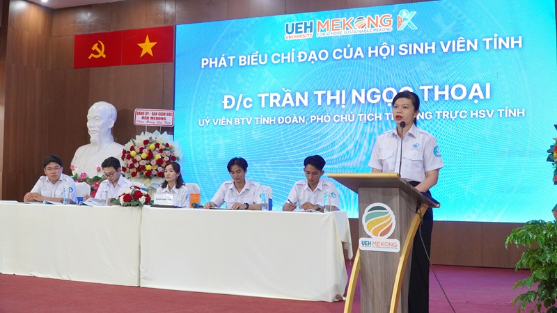 Phát biểu chỉ đạo tại Đại hội, đồng chí Trần Thị Ngọc Thoại - Ủy viên ban Thường vụ tỉnh Đoàn, Phó Chủ tịch thường trực Hội Sinh viên Việt Nam tỉnh Vĩnh Long đánh giá cao tinh thần chủ động, sáng tạo và trách nhiệm của sinh viên UEH Mekong trong nhiệm kỳ vừa qua. Đồng chí ghi nhận nhiều hoạt động hiệu quả của Hội Sinh viên trường trong lĩnh vực hỗ trợ học tập, nghiên cứu khoa học, tình nguyện vì cộng đồng và phát triển kỹ năng, góp phần lan tỏa hình ảnh sinh viên UEH năng động, tri thức và giàu khát vọng cống hiến. Đồng chí nhấn mạnh: “Hội Sinh viên Phân hiệu Vĩnh Long cần tiếp tục phát huy vai trò nòng cốt trong phong trào “Sinh viên 5 tốt”; tăng cường giáo dục chính trị, đạo đức, lối sống; đẩy mạnh mở rộng giao lưu quốc tế; ứng dụng chuyển đổi số trong hoạt động phong trào Hội. Ban Thư ký Hội Sinh viên Việt Nam tỉnh Vĩnh Long kỳ vọng Hội Sinh viên Phân hiệu sẽ tiếp tục là lực lượng chủ lực, dẫn dắt phong trào sinh viên tại địa phương phát triển ngày càng mạnh mẽ và bền vững”.