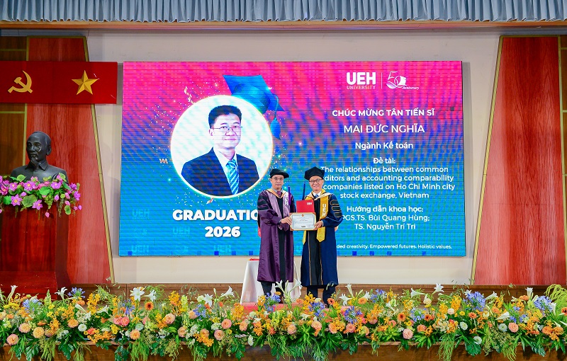 Các Tân Tiến sĩ, Thạc sĩ UEH đã xuất sắc thể hiện năng lực chuyên môn, mở rộng phạm vi nghiên cứu theo hướng liên ngành trong khoa học kinh tế, chủ động ứng dụng công nghệ mới và không ngừng nâng cao trình độ ngoại ngữ phục vụ nghiên cứu, trao đổi học thuật và công bố quốc tế. Đặc biệt, ở bậc Tiến sĩ, năng lực hội nhập quốc tế được khẳng định thông qua 15 bài báo công bố trên các tạp chí uy tín thuộc danh mục Scopus và WoS; đồng thời có 8/17 luận án được viết và bảo vệ hoàn toàn bằng tiếng Anh.
