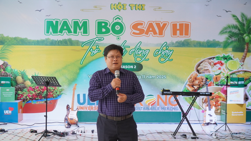 Phát biểu Khai mạc Hội thi, ThS. Hồ Thiện Quyền - Phó Giám đốc UEH Mekong, nhấn mạnh mục đích, ý nghĩa của Hội thi “Nam Bộ say hi” mùa 2 trong việc lan tỏa bản sắc văn hóa và ẩm thực Nam Bộ, tạo môi trường giao lưu giữa sinh viên UEH Mekong và học sinh các trường THPT. Thầy đánh giá cao sự đầu tư và sáng tạo của các đội thi, đồng thời gửi lời cảm ơn đến các đơn vị đã tài trợ và đồng hành với Hội thi, góp phần mang đến một sân chơi ý nghĩa, giúp các bạn trẻ có thêm trải nghiệm, kỹ năng và sự tự hào về văn hóa quê hương.
