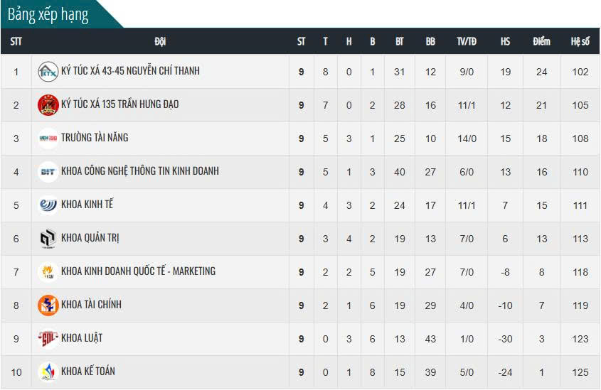 Thứ tự bảng xếp hạng của 10 đội sau 9 lượt trận vòng bảng