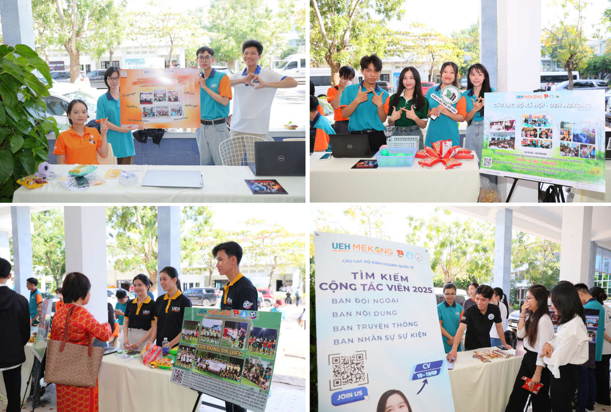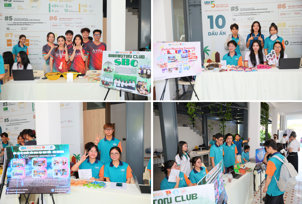 Sinh viên checkin và tham gia các hoạt động triển lãm tại sảnh B tại UEH Mekong