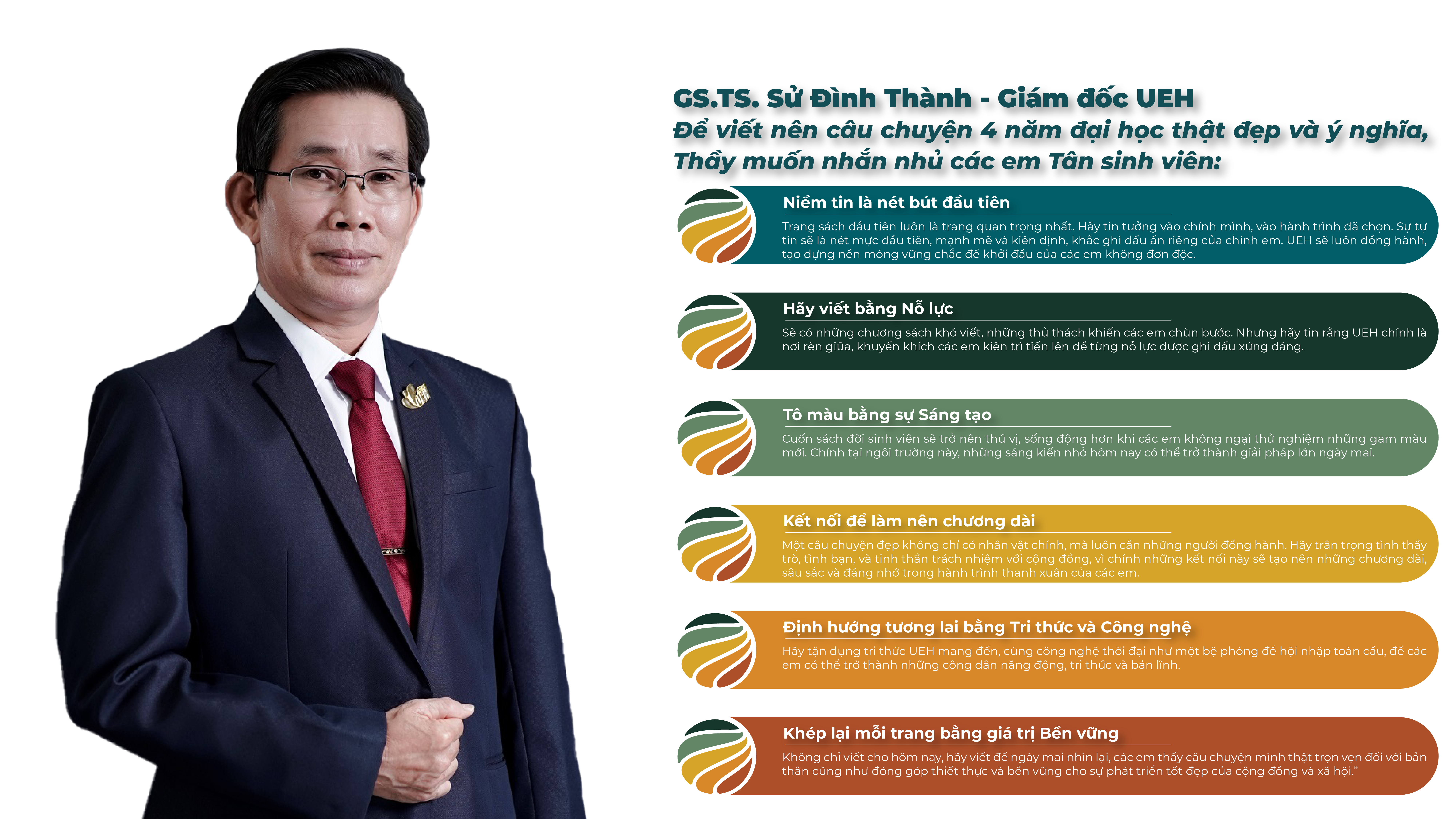 Thầy cô UEH luôn bên cạnh, dõi theo và giúp các em trở thành phiên bản tuyệt vời nhất. Hãy cùng nhau làm rạng rỡ truyền thống UEH và mở ra tương lai rộng lớn cho chính các em. Chúc các em một hành trình 4 năm thành công!”