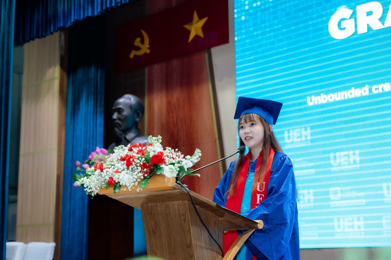 Ngập tràn cảm xúc về những năm tháng đại học, Tân cử nhân Võ Thị Như Ý, khóa 47, Kinh doanh quốc tế - UEH MeKong vinh dự và tự hào phát biểu: “Chúng em tự hào không chỉ vì đã hoàn thành chặng đường đại học, mà còn vì đã được học tập tại một Đại học trọng điểm quốc gia - Đại học Kinh tế TP.HCM (UEH) - Một ngôi trường Đào tạo đa ngành, có uy tín hàng đầu trong lĩnh vực kinh tế, quản lý, kinh doanh, luật, ngoại ngữ và công nghệ và đặc biệt hơn, chúng em được bắt đầu nơi phù hợp theo điều kiện bản thân của chúng em - UEH Mekong. Lựa chọn UEH Phân hiệu Vĩnh Long, nay là UEH Mekong, không chỉ là một quyết định về nơi học, mà là một quyết định cho tương lai và thật sự chúng em có một hành trình trải nghiệm đầy ý nghĩa. Tại đây, dù là Phân hiệu nhưng chúng em vẫn được tiếp cận với kiến thức hiện đại, chương trình đào tạo tiên tiến và phương pháp giảng dạy đổi mới. Không chỉ dừng lại ở lý thuyết, UEH luôn hướng đến việc trang bị cho sinh viên tư duy thực tiễn, sáng tạo và bản lĩnh hội nhập. Mỗi giờ học không chỉ là bài giảng trên lớp mà còn là những bài học về kỹ năng, kinh nghiệm và sự định hướng quý báu từ Thầy, Cô UEH. Em thay mặt cho các tân cử nhân, xin bày tỏ lòng biết ơn sâu sắc đến Ban Giám đốc Phân hiệu Vĩnh Long và quý Thầy Cô tại Phân hiệu, Thầy/Cô không chỉ là những người thầy, người cô tận tụy trên giảng đường, Thầy Cô còn là những người luôn đồng hành như người cha, người mẹ, người anh, người chị trong gia đình, sẵn sàng chia sẻ, động viên và giúp đỡ chúng em trong suốt những năm tháng học tập tại đây. Đặc biệt, gửi lời tri ân đến Thầy/Cô của cơ sở chính đã vất vả hàng tuần về với UEH Mekong để truyền đạt kiến thức cho chúng em. Chúng em gửi lời tri ân đến Thầy Cô cố vấn học tập cũng đã luôn lắng nghe, hướng dẫn và hỗ trợ chúng em vượt qua mọi khó khăn, không chỉ trong học tập mà cả trong cuộc sống”.