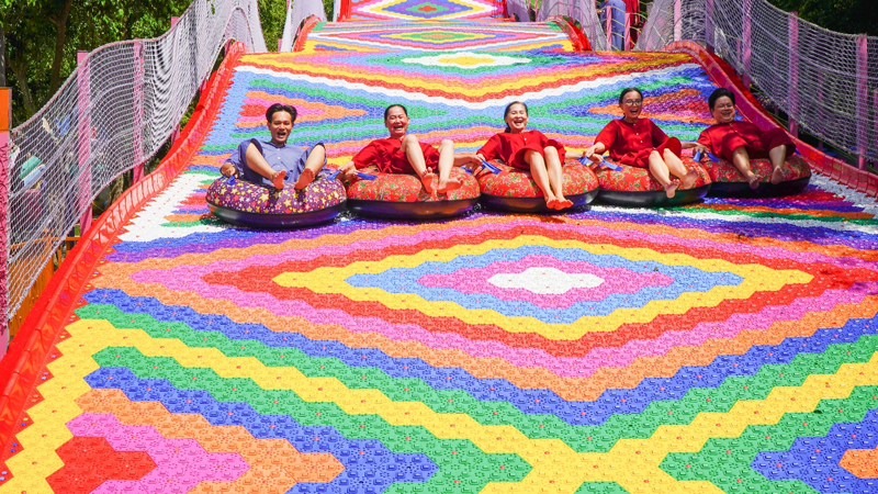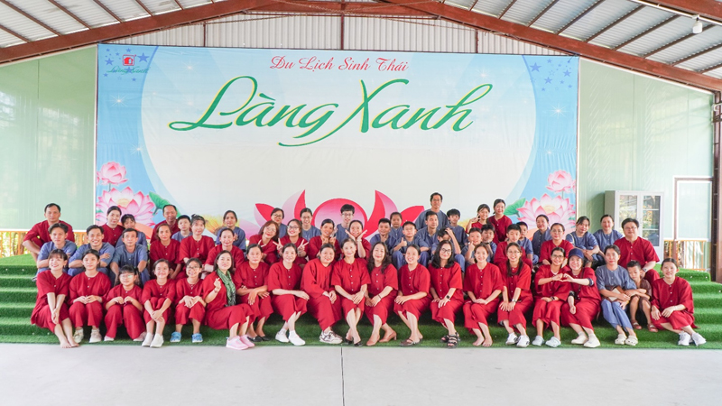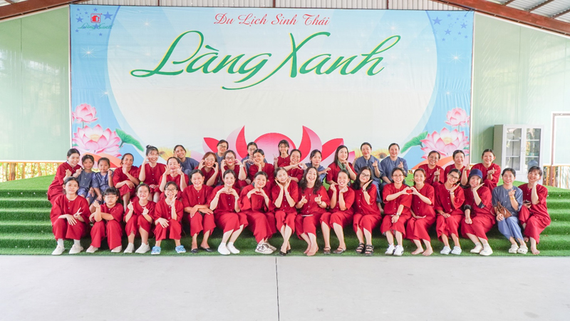 Đoàn mặc trang phục áo bà ba chụp ảnh lưu niệm và tham gia các trò chơi dân gian tại Khu du lịch sinh thái Làng Xanh