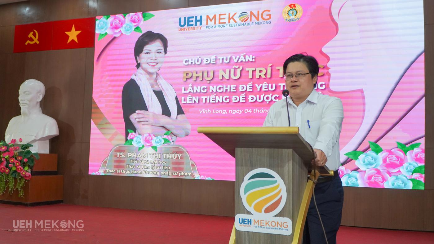 ThS. Hồ Thiện Quyền - Phó Giám đốc, Chủ tịch Công đoàn cơ sở UEH Mekong phát biểu và phát động phong trào thi đua “Giỏi việc nước, Đảm việc nhà”