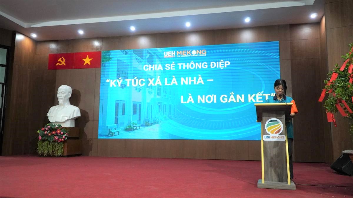 Đồng thời tại buổi giao lưu các bạn Tân sinh viên K51 còn được nghe phần chia sẻ thông điệp với chủ đề “Ký túc xá là nhà - nơi gắn kết” đến từ 02 sinh viên Trần Quốc Khánh - Thành viên đội sinh viên tự quản, phòng B1.2 và Huỳnh Thị Mỹ Linh - phòng A2.15. Các bạn đã chia sẻ về kinh nghiệm để thích nghi được với môi trường tại ký túc xá, phương pháp học tập và sinh hoạt hiệu quả tại KTX, làm thế nào để các thành viên trong phòng KTX có thể gắn kết như một gia đình nhỏ. Qua nội dung chia sẻ, phần nào có thể giúp các bạn Tân sinh viên hiểu hơn và có giải pháp cho chính bản thân mình để thích nghi tại môi trường KTX trong hơn 3 năm học tại UEH Mekong.