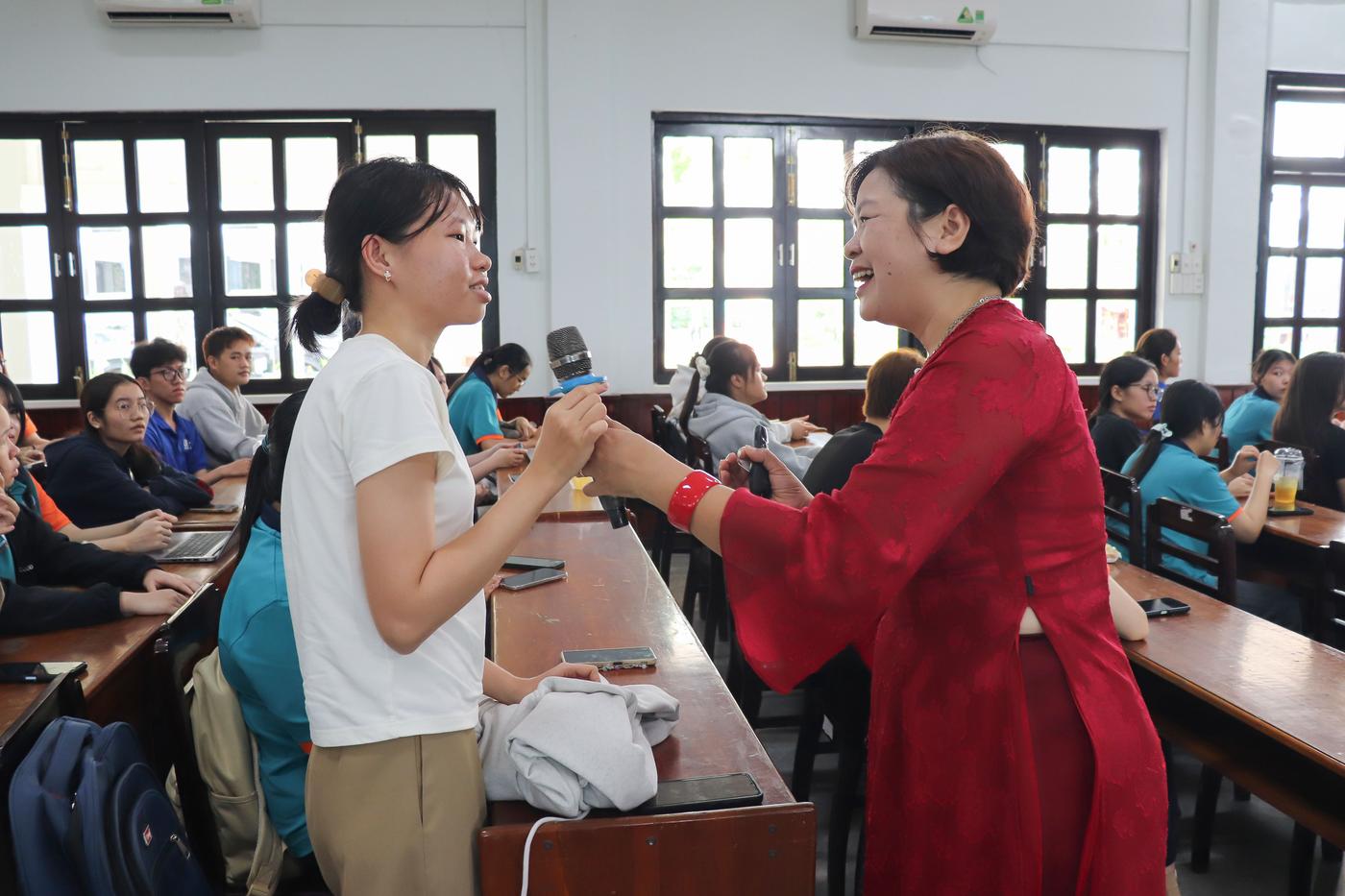 Tiếp theo Chương trình, sinh viên được chia sẻ chuyên đề về “Vai trò Phụ nữ trí thức trong gia đình và sự nghiệp”. Thông qua buổi chia sẻ, diễn giả đã giúp các bạn sinh viên nữ nhận diện rõ hơn những áp lực mà phụ nữ thường gặp phải như: kỳ vọng xã hội, trách nhiệm gia đình, sự nghiệp cá nhân và nhu cầu khẳng định giá trị bản thân. Từ đó, cô định hướng cho sinh viên biết cách yêu thương chính mình, xác lập mục tiêu rõ ràng và chủ động chuẩn bị hành trang tri thức lẫn kỹ năng sống ngay từ khi còn là sinh viên.