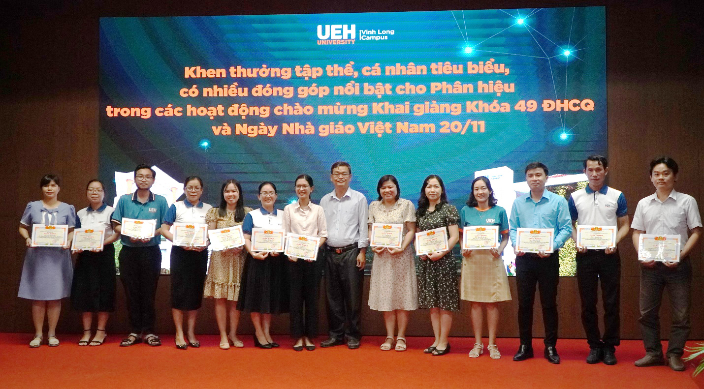 Tại Hội nghị, Ban Giám đốc UEH - Phân hiệu Vĩnh Long cũng đã biểu dương và khen thưởng 07 tập thể và 23 cá nhân đã có nhiều đóng góp, tích cực hoàn thành xuất sắc nhiệm vụ tuyển sinh năm 2023; khen thưởng 10 tập thể và 29 cá nhân tiêu biểu, có nhiều đóng góp cho PHVL trong các hoạt động chào mừng khai giảng Khóa 49 ĐHCQ năm 2023 và Kỉ niệm ngày Nhà giáo Việt Nam 20/11.