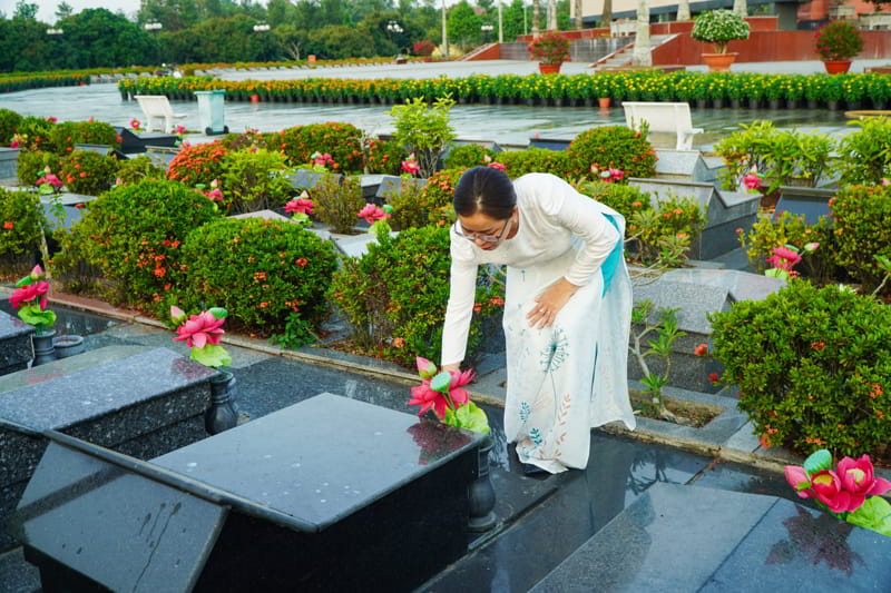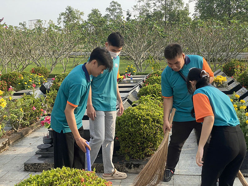 Đoàn viên thanh niên UEH Mekong tham gia dọn dẹp vệ sinh tại Nghĩa trang liệt sĩ tỉnh Vĩnh Long