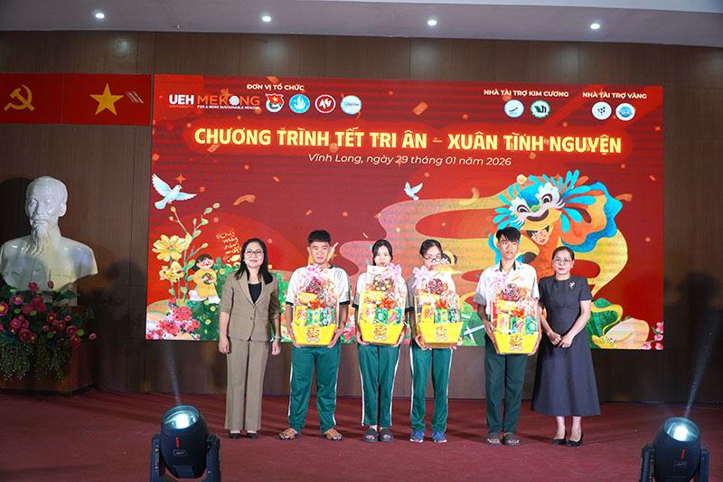 Tiếp nối chuỗi hoạt động sẻ chia, Đoàn – Hội UEH Mekong và các CLB trực thuộc đã trao 50 phần quà Tết cho học sinh, sinh viên nỗ lực vươn lên trong học tập; thăm hỏi, tặng quà cho thanh niên công nhân và 52 hộ gia đình có hoàn cảnh khó khăn tại phường Tân Hạnh, phường Phước Hậu, xã Long Hồ, xã Nhơn Phú. Bên cạnh đó, CLB Nghiên cứu Marketing, CLB Kinh doanh quốc tế cũng đã trao nhu yếu phẩm cho các cụ già tại Trung tâm Công tác xã hội tỉnh Vĩnh Long.