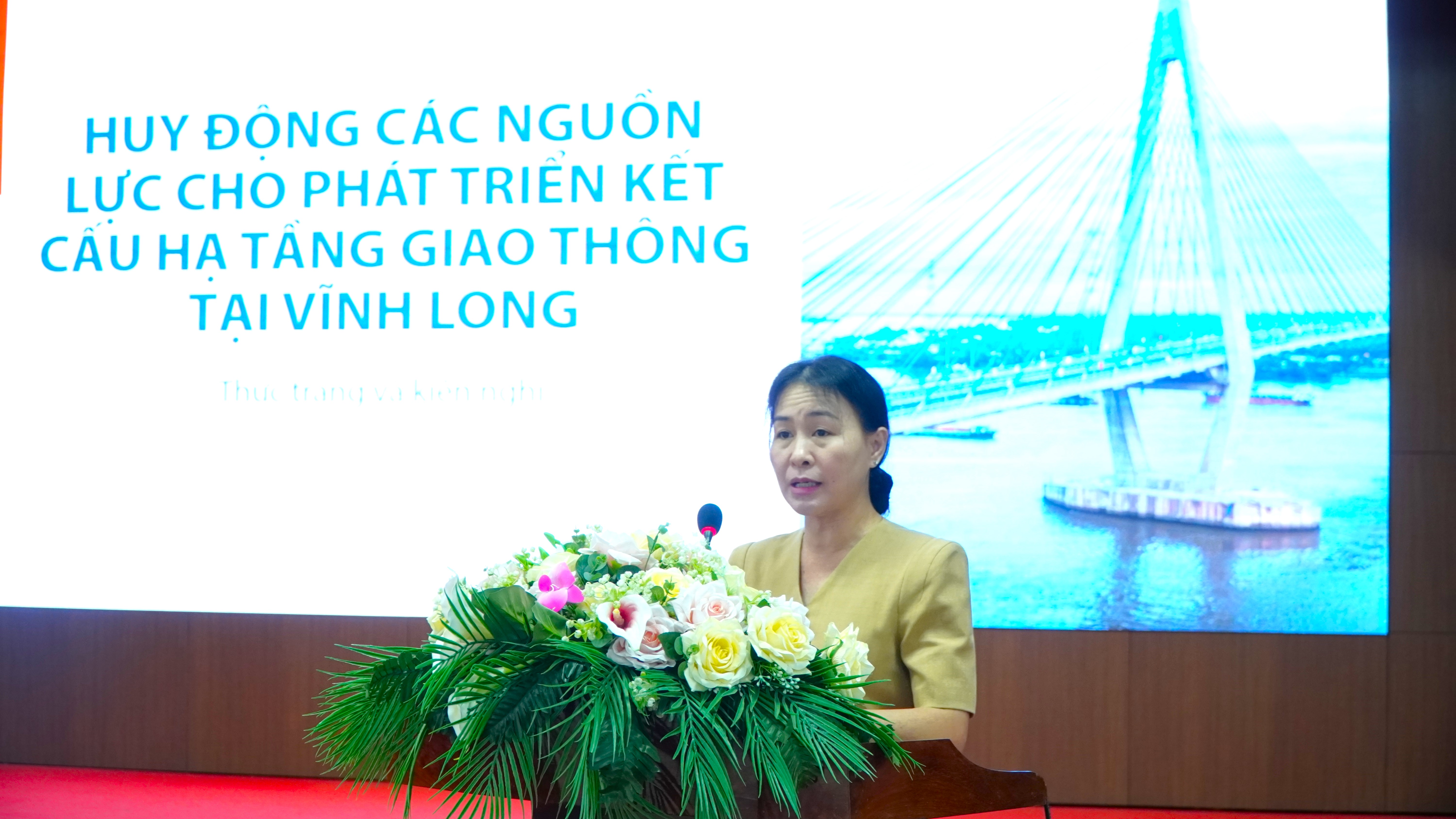 Bà Đinh Thị Như Thảo – Phó Giám đốc Sở Tài chính tỉnh Vĩnh Long trình bày tham luận “Huy động các nguồn lực cho phát triển kết cấu hạ tầng giao thông tỉnh Vĩnh Long: Thực trạng và kiến nghị”