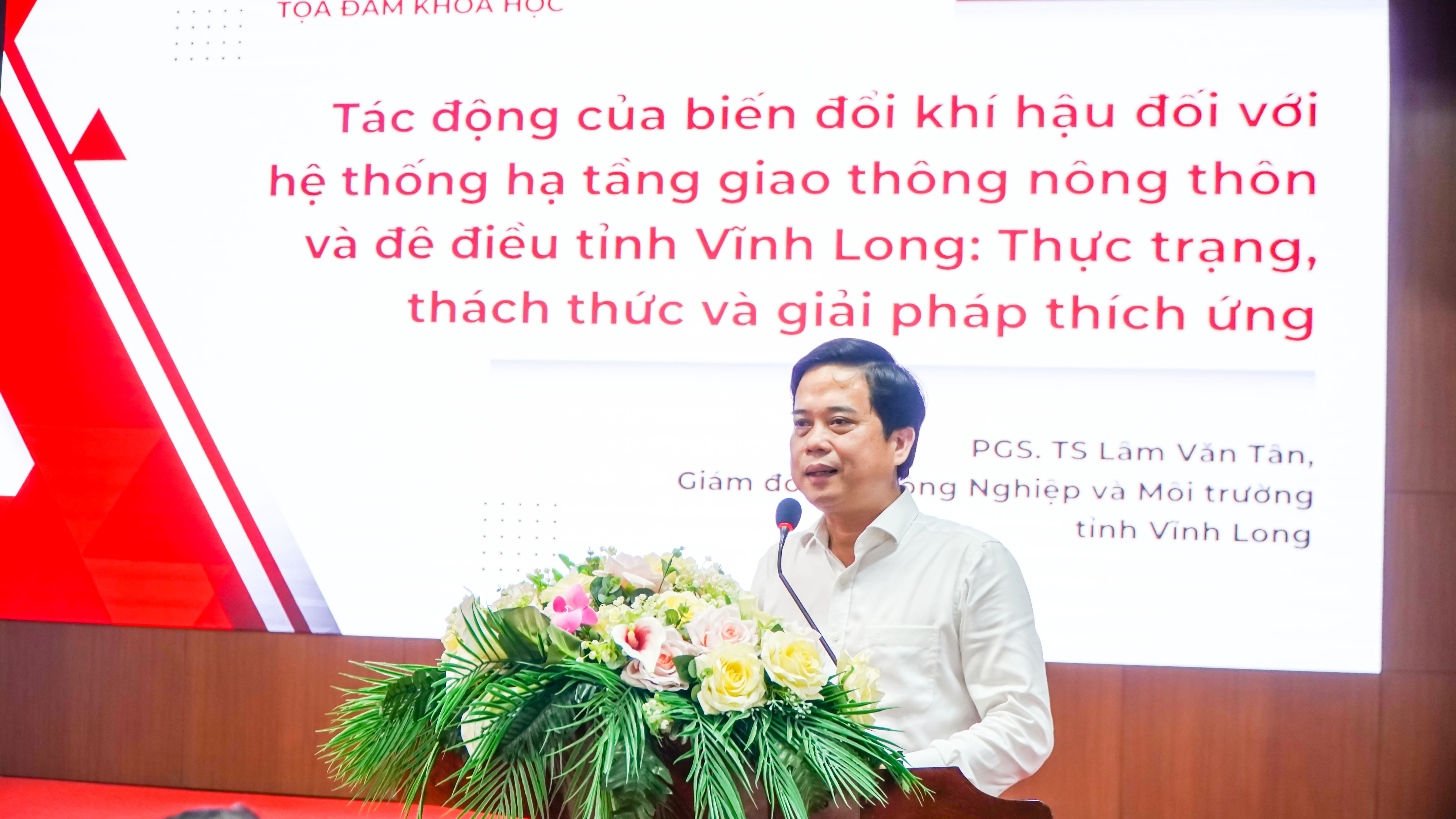 PGS.TS Lâm Văn Tân - Giám đốc Sở Nông nghiệp và Môi trường trình bày tham luận “Tác động của biến đổi khí hậu đối với hệ thống kết cấu hạ tầng giao thông tỉnh Vĩnh Long: Thực trạng và giải pháp”
