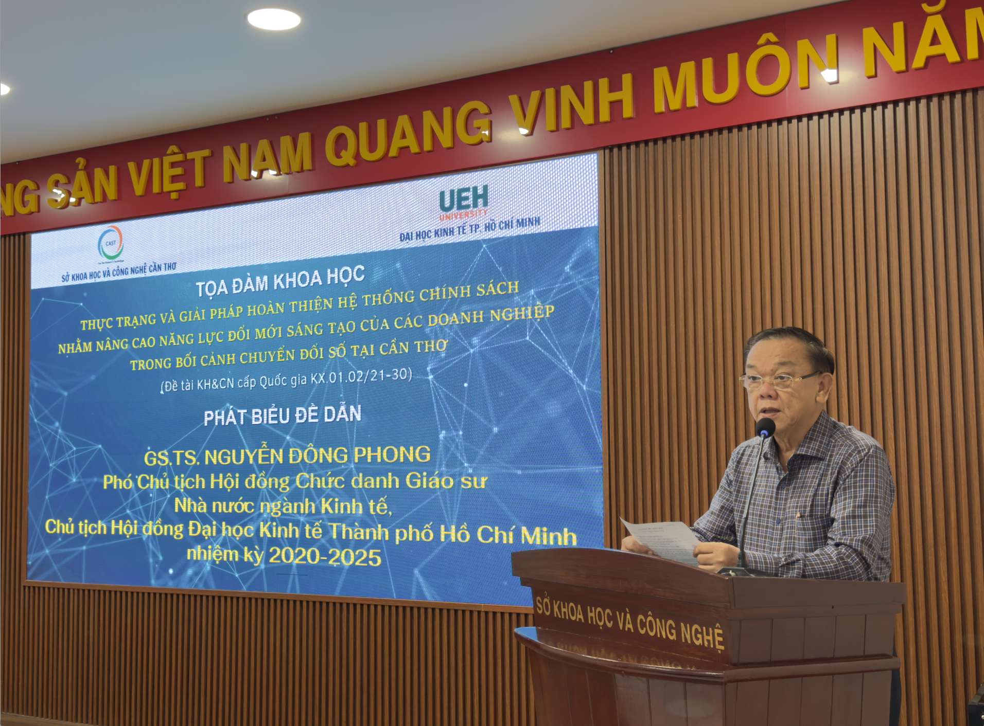 GS.TS Nguyễn Đông Phong – Phó Chủ tịch Hội đồng Chức danh Giáo sư Nhà nước ngành Kinh tế, Chủ tịch Hội đồng Đại học Kinh tế Thành phố Hồ Chí Minh nhiệm kỳ 2020 - 2025 phát biểu đề dẫn