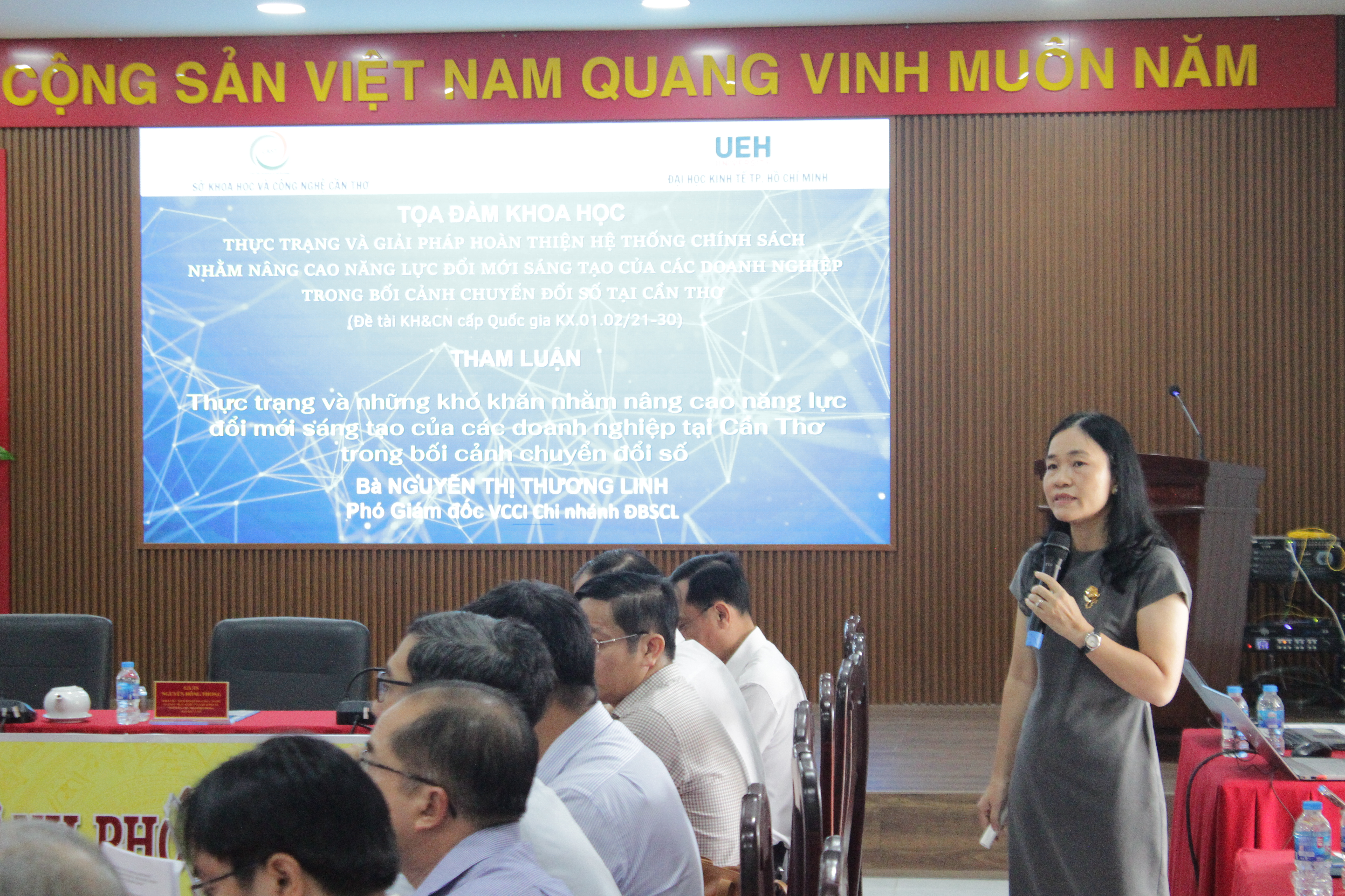 Chương trình tọa đàm diễn ra với 02 phiên thảo luận chính. Phiên thứ nhất tập trung vào chủ đề “Thực trạng và giải pháp hoàn thiện hệ thống chính sách nhằm nâng cao năng lực đổi mới sáng tạo của doanh nghiệp trong bối cảnh chuyển đổi số tại Cần Thơ”, trong đó đại diện Sở Khoa học và Công nghệ Cần Thơ đã trình bày “Phát triển khoa học công nghệ mới và đổi mới sáng tạo trong kỷ nguyên mới nhằm đạt mục tiêu phát triển kinh tế xã hội thành phố Cần Thơ đến năm 2030, tầm nhìn 2045”; đại diện VCCI Chi nhánh Đồng bằng sông Cửu Long phân tích những khó khăn, thách thức đối với doanh nghiệp trong quá trình chuyển đổi số qua bài tham luận “Thực trạng và khó khăn nhằm nâng cao năng lực đổi mới sáng tạo của các doanh nghiệp tại Cần Thơ trong bối cảnh chuyển đổi số”. Các ý kiến thảo luận đều khẳng định vai trò trung tâm của doanh nghiệp trong đổi mới sáng tạo, Nhà nước đóng vai trò kiến tạo, còn giáo dục – đào tạo là nền tảng, đúng tinh thần Nghị quyết số 57-NQ/TW của Bộ Chính trị.